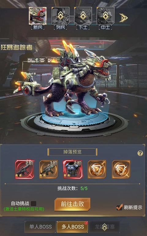 击杀单人boss可以获得人物装备,玩家等级和晋升等级越高,解锁的BOSS越多,每个BOSS每日均可挑战2次,SVIP2可激活一键扫荡,直接获得奖励。