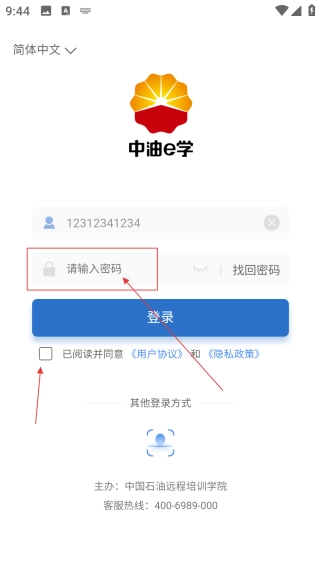 3、在登录页【填写对应密码】,勾选【协议】完成账号登录的信息核对步骤。
