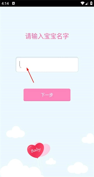 2、在宝宝名字输入页面,点击输入框,输入宝宝名字,点击下一步,进入宝宝生日选择页面。