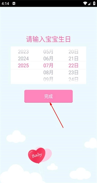 3、在宝宝生日选择页面,选择具体日期,点击完成,进入宝宝计划主界面。