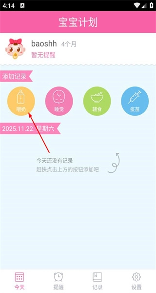 4、在宝宝计划主界面,看到喂奶、睡觉等记录选项,点击喂奶,开始添加喂奶记录。