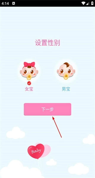 1、打开软件后,进入性别设置界面,选择女宝,点击下一步,进入宝宝名字填写页面。