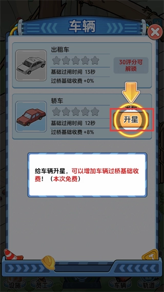 1、进入车辆界面后,找到【轿车】对应的升星按钮并点击,通过免费升星的方式能够提高过桥的基础收费标准,从而增加整体收益。