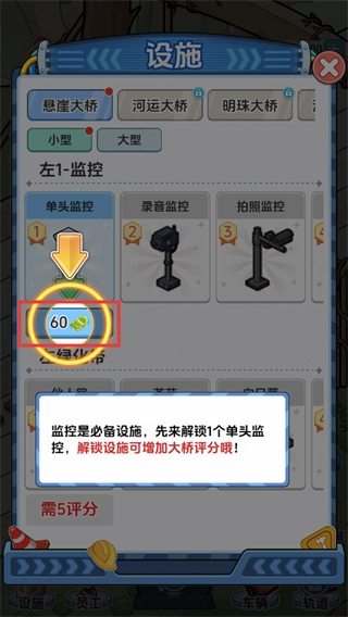 2、在设施界面,用【60】-【金币】解锁【单头监控】,解锁后可增加大桥评分,满足评分要求。