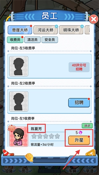 4、在员工界面,消耗【5】-【钻石】给【陈夏芳】升星,提升客流量,增加过桥车辆的收益。