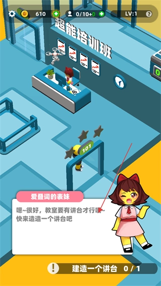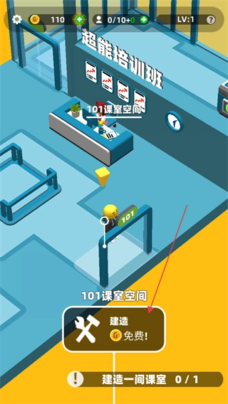 1、按照任务提示(例如建造一间课室),点击对应的建造区域,选择免费建造选项,比如101课室空间。