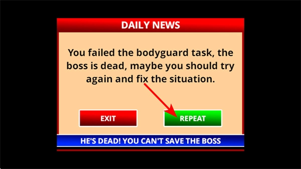 4、任务失败后,点击REPEAT按键,可重新开始任务,调整策略以顺利完成保镖任务。