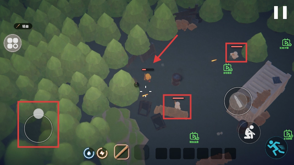 4、战斗时,用左侧摇杆移动角色,瞄准敌鸭射击,击败后搜刮掉落物,注意躲避攻击。
