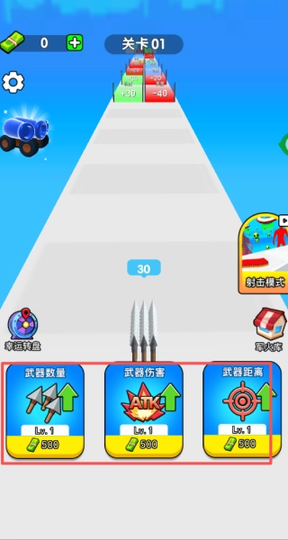 1、在每一关开启前,你可以从武器数量、伤害、攻击距离等技能维度里挑选想要提升的方向,随后便可启动闯关挑战。
