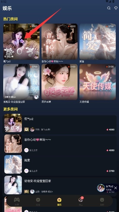 3、进入娱乐专区浏览热门语音房间推荐,选择感兴趣的房间点击进入参与互动。