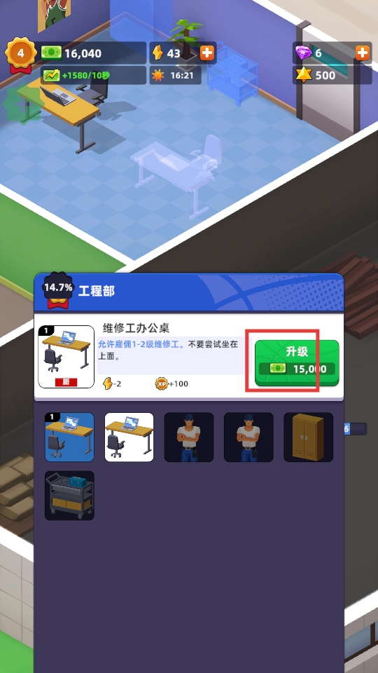3、点击【升级】,升级维修工办公桌,雇佣1-2级维修工,增强工程部功能。