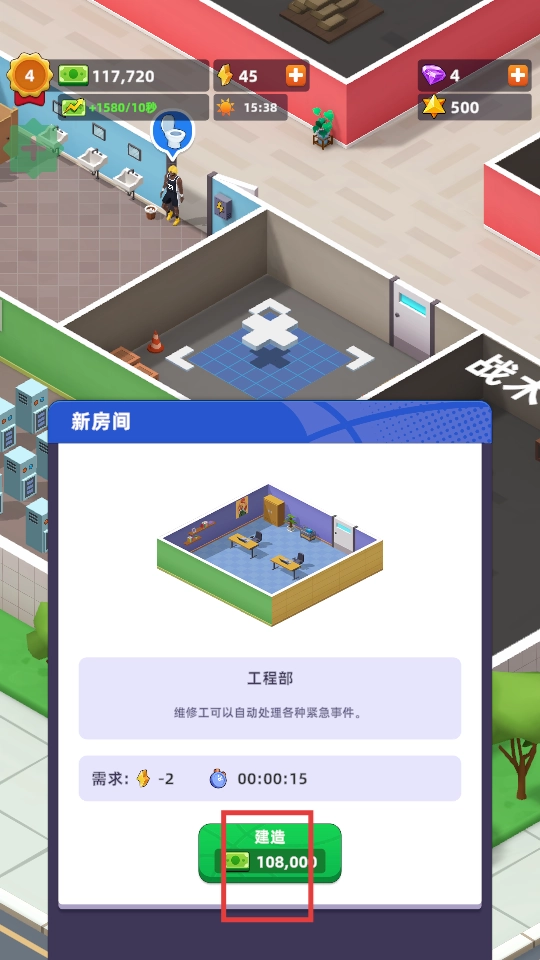 2、点击【建造】,建造工程部,让维修工自动处理紧急事件,保障篮球馆运营。