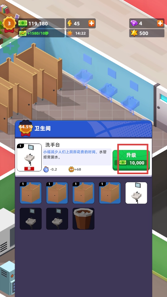 1、点击【升级】按钮,完成洗手台的升级操作,以此提高卫生间设施的等级,进而优化篮球馆的整体体验。