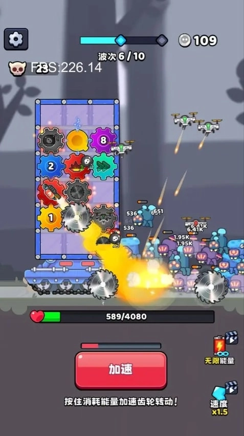 资源管理与升级机制:战斗过程中,玩家要密切关注能量数值,对资源进行合理分配。当完成特定波次的战斗后,可前往商店购买更厉害的齿轮,像×1.5增益齿轮,以此增强后续战斗的能力。