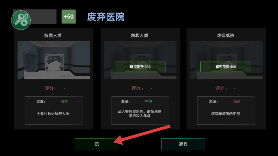 1、点击【玩】,进入废弃医院的简单难度任务,开始解救人员的冒险。