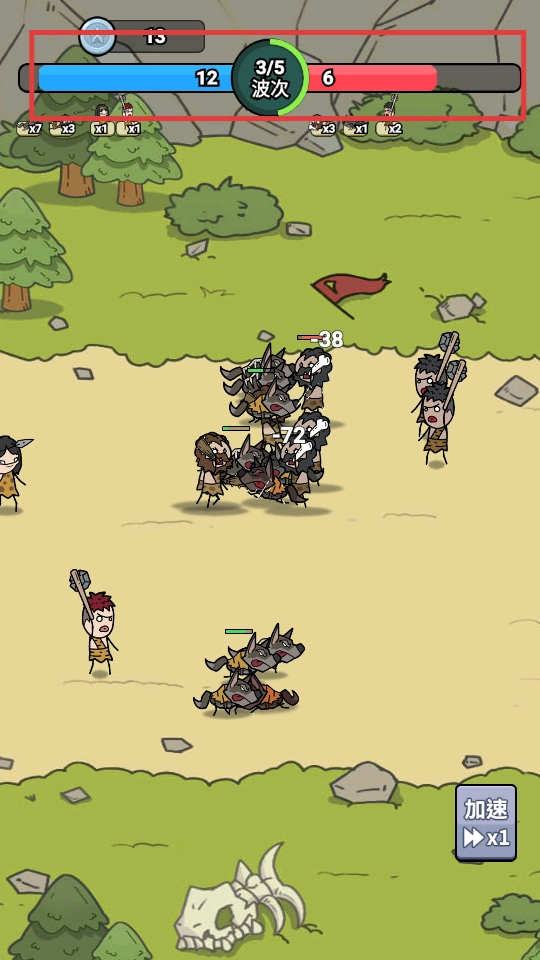 2、关注波次和双方战力,指挥小兵作战,推进战斗进程。