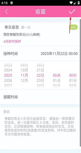 4、在疫苗详情页面,设置接种时间等信息,完成疫苗提醒设置,界面操作简便清晰。