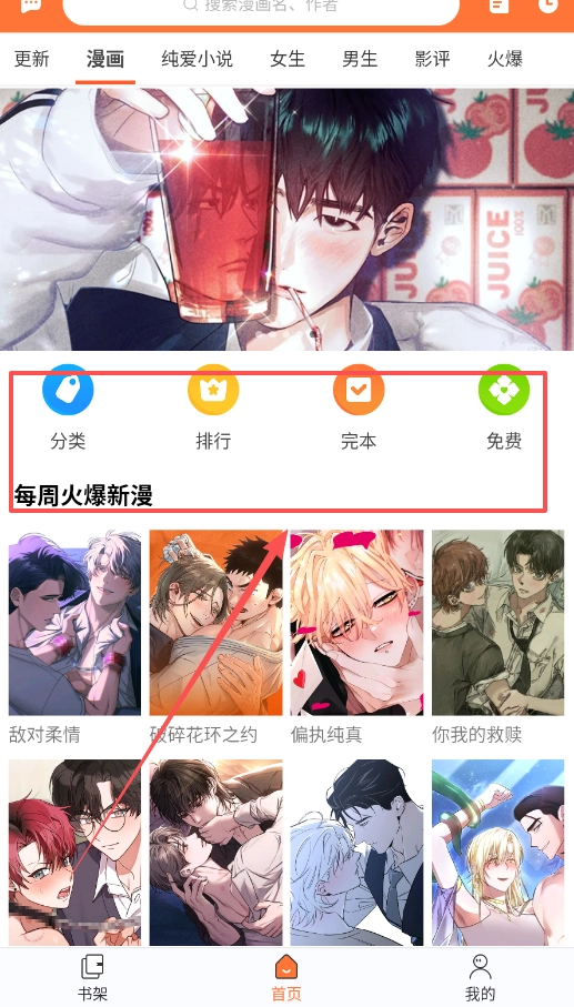2、进到首页后,上面有很多按钮可以点着玩,看看分类呀排行呀,中间还有推荐的新漫画。
