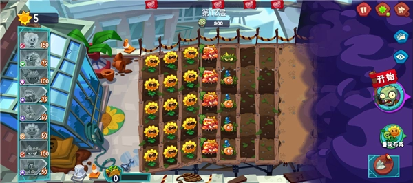 1、开局就这么布局,先让向日葵产出阳光,然后逐步把向日葵补齐,前期阳光不足的话,薄荷就选火属性的。