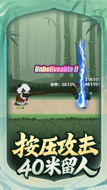 你以为让你先跑40米就安全了?太天真了!在这款魔性十足的休闲战斗游戏中,你将扮演一只手持巨斧的熊猫大侠,面对各种蠢萌怪物,只需按住屏幕——斧头就会疯狂伸长!精准计算距离,松手一斧劈下,让怪物们知道什么叫“跑再远也躲不过这一刀”!