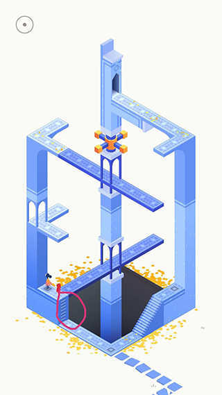 因为我在玩这个游戏的时候 ,在这个地方我也是思考了几分钟,这里看似是无路可走了,但是标记的地方是一个楼梯,那么我们点击一下楼梯下面的道路,我们就可以下去了。下去之后我们让齿轮机关向左滑动,使人物可以顺利通过前方道路,进入最顶端的门口时就可以进入下一关了。