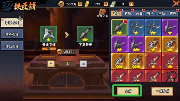 将普通装备合成升级至下忍、中忍、上忍等,也可以快速提高装备的各属性。