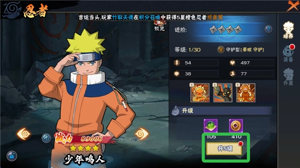 在拥有足够的材料忍者后,玩家可以给忍者升星,速度等属性将大大提升。