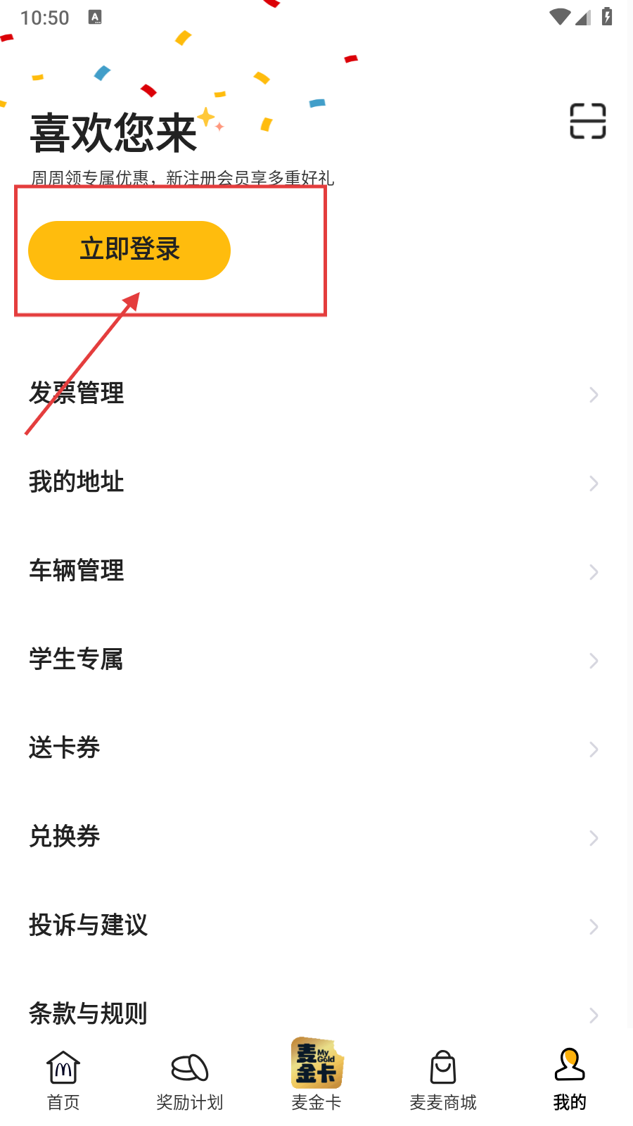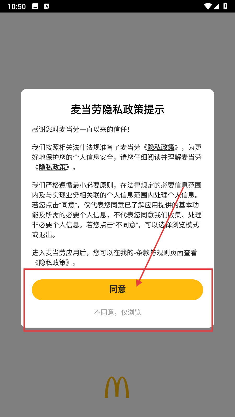 1、使用麦当劳前,请务必阅读《隐私政策》,点击【同意】按钮后即可进入软件。