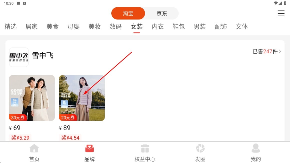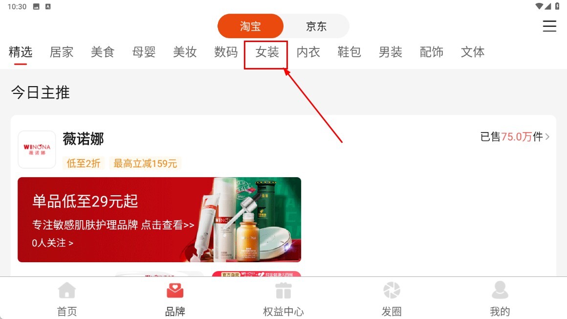2、在品牌页,点击【女装-分类标签】,切换到女装商品列表页。