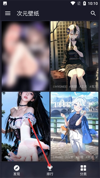 1、打开【次元壁纸】界面,点击底部的【排行】选项,进入壁纸排行板块,就能看到各类排行的入口。