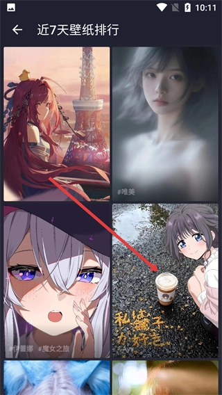 3、在近7天壁纸排行列表中,选择如带咖啡杯的动漫壁纸条目,进入壁纸详情页。