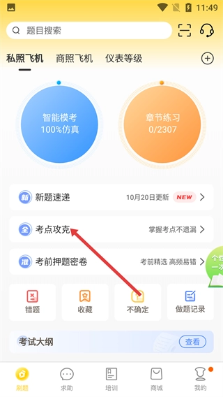 1、进入刷题页面后,点击【考点攻克】,即可进入考点练习板块,此板块内还设有新题速递、考前押题密卷等功能入口。