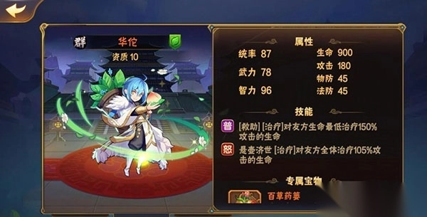 华佗是群雄唯一的治疗,也是放2治疗量最大的奶。前期推图十分好用,但是羁绊来说4人羁绊3个未出,关羽是蜀国核心,羁绊难以成型,而且整个群雄阵容都是面伤阵容,对敌伤害达不到秒杀,后期不是十分推荐。