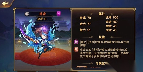 陈宫是群雄的输出后排刺客,怒攻后排3人加中毒状态,输出可以,也是面伤带毒,对于群雄来说十分契合,但是因为2个3人羁绊不能成型,橙10还是以张角为主,卡片获取难度一般,总体效果差强人意,不是特别推荐。