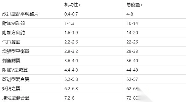 各星阶机翼级别属性提升范围如下表所示: