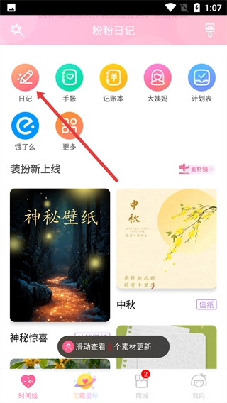 1、打开粉粉日记并进入首页后,找到并点击【日记】功能图标即可进入日记记录页面;此外,首页还设有手帐、记账本等其他功能入口,方便用户记录各类不同的内容。
