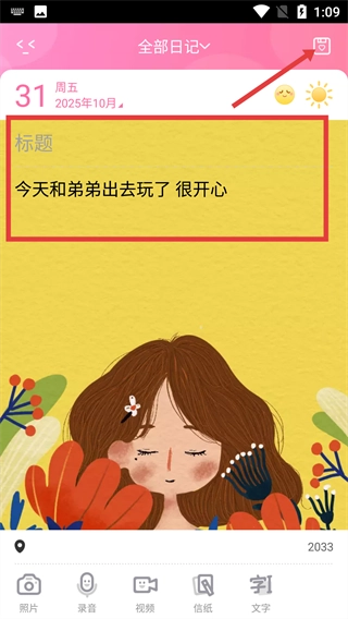 3、在日记编辑界面,填写日记标题和内容,例如“今天和弟弟出去玩了很开心”,然后点击保存按钮。