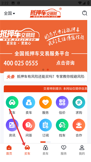 1、打开抵押车交易网首页后,找到并点击【买车】选项,即可进入我要买车页面。