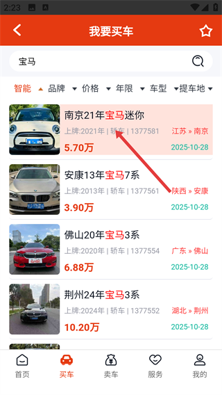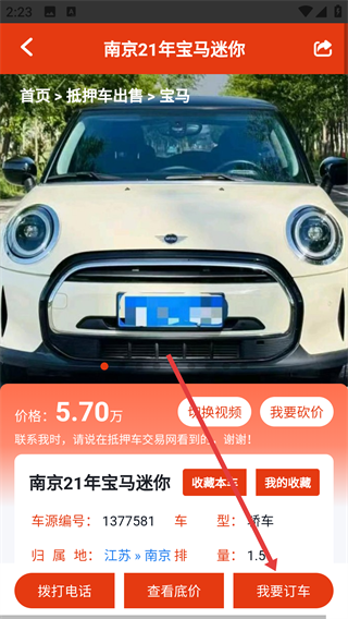 3、在车辆列表中选择目标车辆如【南京21年宝马迷你】,进入该车详情页面。