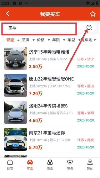 2、在我要买车页面的搜索栏输入品牌如【宝马】,点击搜索图标,获取相关车辆列表。