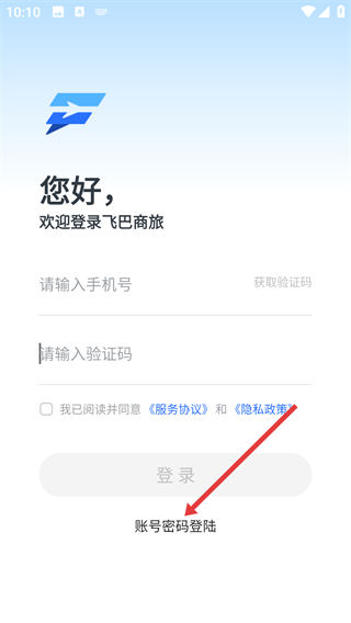 打开飞巴商旅应用,映入眼帘的第一个界面是带有其标识的启动页,该页面为软件加载阶段的初始展示界面,需待加载流程结束后,方可开展后续操作。