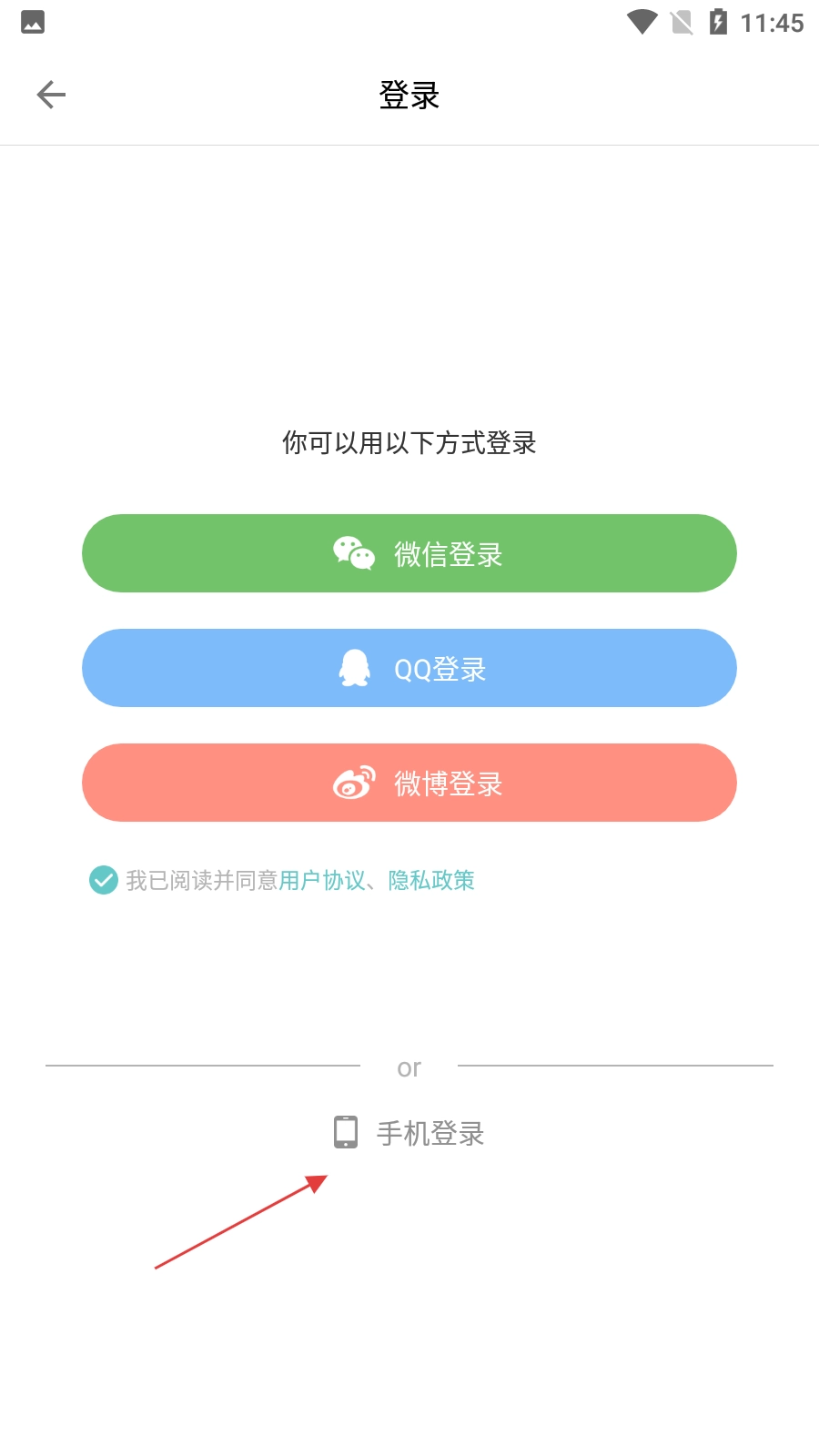 3、在登录界面,可选择【微信登录】【QQ登录】【微博登录】,也可点击【手机登录】选择手机号登录方式。