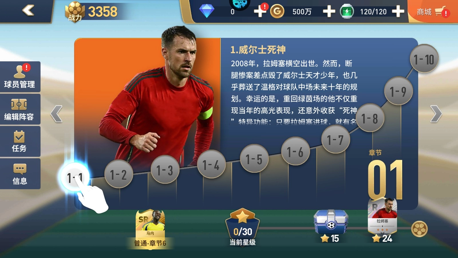各位刚进入游戏的经理人可以跟随新手引导通过群星闪耀第1章剧情并获取R拉姆塞,后续每过一张群星闪耀章节可以获取一位球员,所以我们要做得就是快速推进主线剧情以获取更多球员,第六章主线全部3星通关后可以获取SR边锋马内,世界挑战赛1-10白俄罗斯完美通关可以获取SR后卫J博阿滕。
