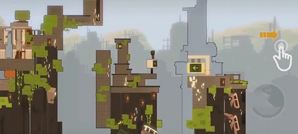 刚开始第一章的时候游戏的关卡难度并不高,更多的是一个教学体验。在玩家们熟悉跳跃之后,就来到了游戏第一个需要知道的知识点。玩家们可以点击屏幕,然后滑动视野,将原本的视野转向,从而利用视觉的错觉形成一条新的道路。这一点是游戏的核心机制,异常的巧妙。