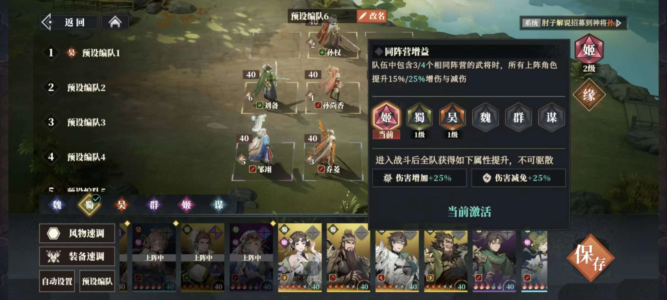 1、上阵3吴3蜀武将时,不能同时激活两个3阵营光环(因为只取最高),但可通过吴蜀6人中有4姬来激活4阵营光环。这样就可以同时获得阵营光环25%+吴蜀联姻15%=40%增减伤的高额加成。