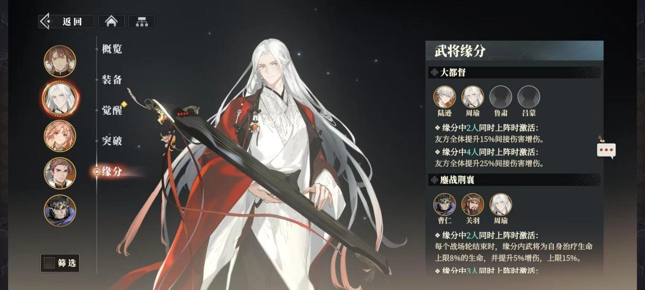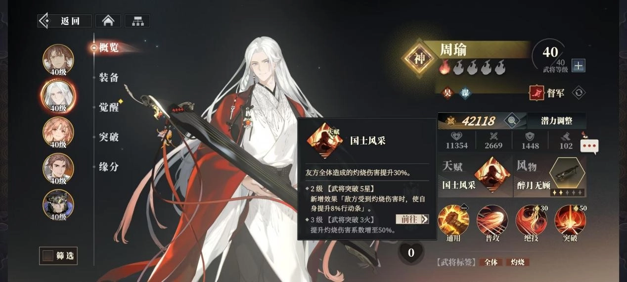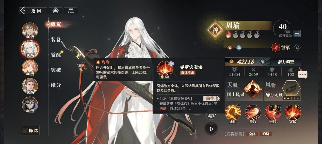 周瑜的天赋【国士风采】和缘分【大都督】都能提升全队的灼烧伤害。