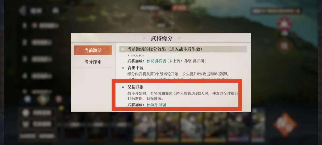 以孙尚香缘分【吴蜀联姻】为核心,搭配3吴3蜀(其中4人为姬阵营)可同时获得阵营和缘分的双重加成,共计40%增减伤,在基础上就领先其他所有阵容一大截。