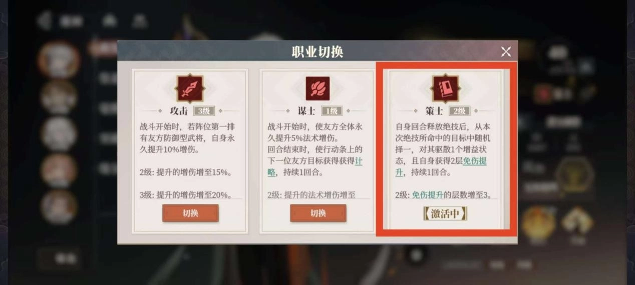 陆逊转职【策士】获得驱散能力,并在施放大招后大幅提升自身免伤。(因陆逊基础速度低于周瑜,所以不推荐转职谋士)
