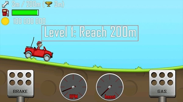 3、进入游戏后,系统会给你一个目标,例如驾驶汽车到达200m。然后我们利用左右前进后退两个按钮来驾驶汽车