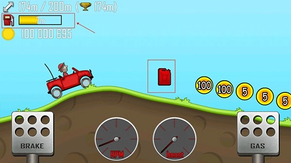 5、游戏界面左上角会显示你的汽车燃料,当燃料不足时你需要尽快拾取汽油桶来为车辆增加燃料